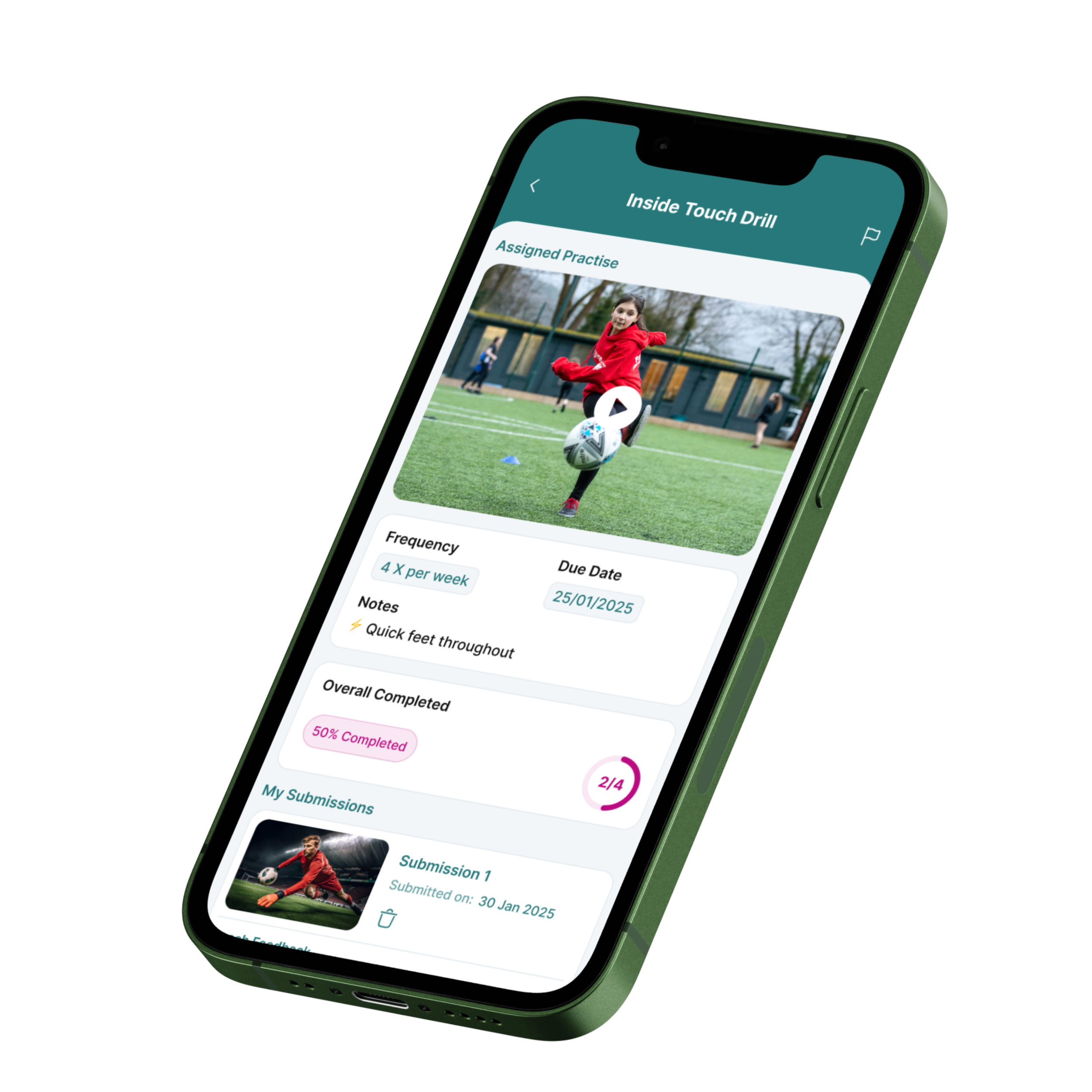 Build training programmes once and send them to every player's phone. Practices, video demos, weekly plans — all in their pocket, all the time. Your coaching methodology reaches them on Tuesday night just like it does on Saturday morning.